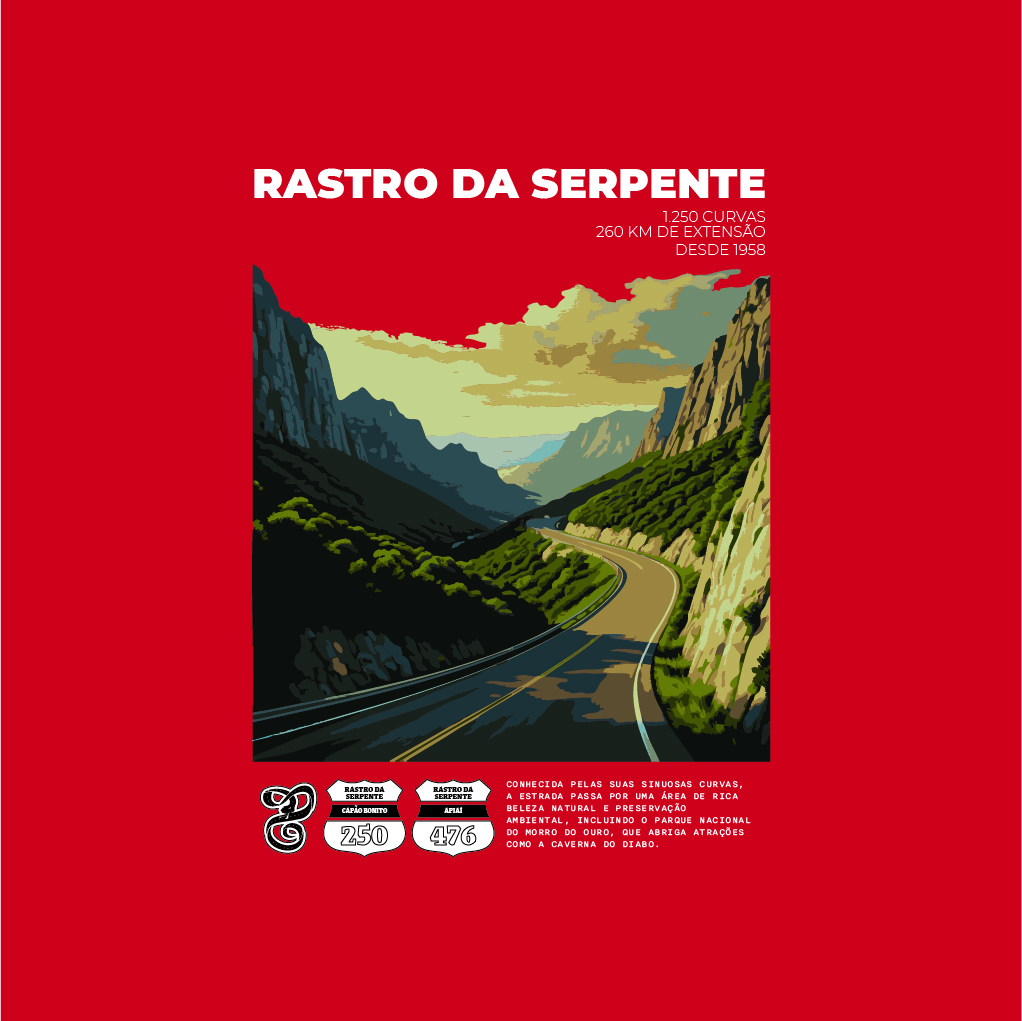 Apresentamos a camiseta "Rastro da Serpente - SP-250 e BR-476" da nossa coleção Rotas Icônicas! Inspirada em uma das estradas mais desafiadoras e queridas entre os motoviajantes, essa estampa traz a essência de aventura e liberdade sobre duas rodas. Com mais de 250 km de extensão e 1.250 curvas sinuosas, o Rastro da Serpente é um símbolo de coragem para aqueles que buscam a verdadeira emoção na estrada. Vista o espírito desta rota lendária e leve consigo um pedaço das curvas e paisagens brasileiras!