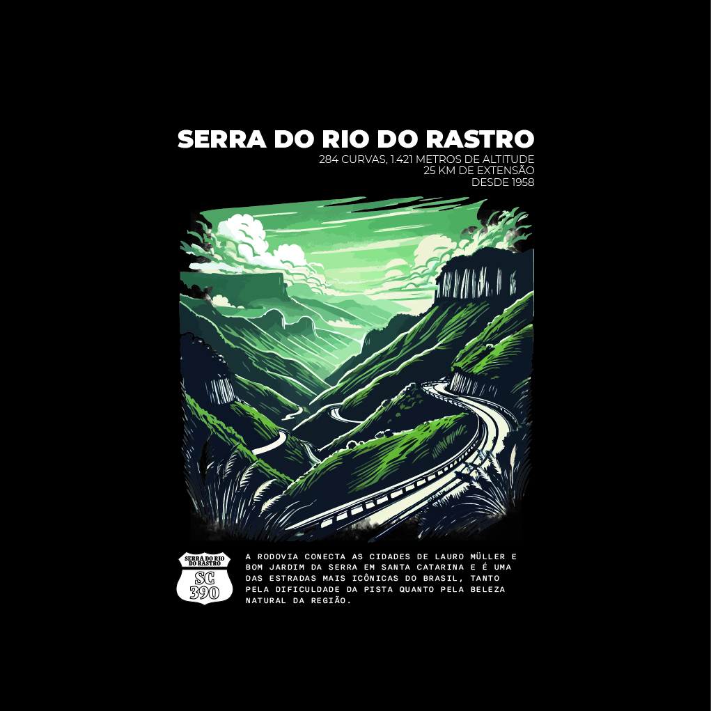 Exclusiva para os aventureiros das estradas, a camisa "Serra do Rio do Rastro" homenageia uma das rodovias mais icônicas e desafiadoras do Brasil. Com suas 284 curvas em 25 km de extensão e uma altitude de 1.421 metros, essa estrada liga Lauro Müller a Bom Jardim da Serra, em Santa Catarina, e é famosa por suas paisagens dramáticas e vistas de tirar o fôlego. Seja transportado para as montanhas sinuosas com esta peça, feita para quem admira a beleza bruta das rotas brasileiras.